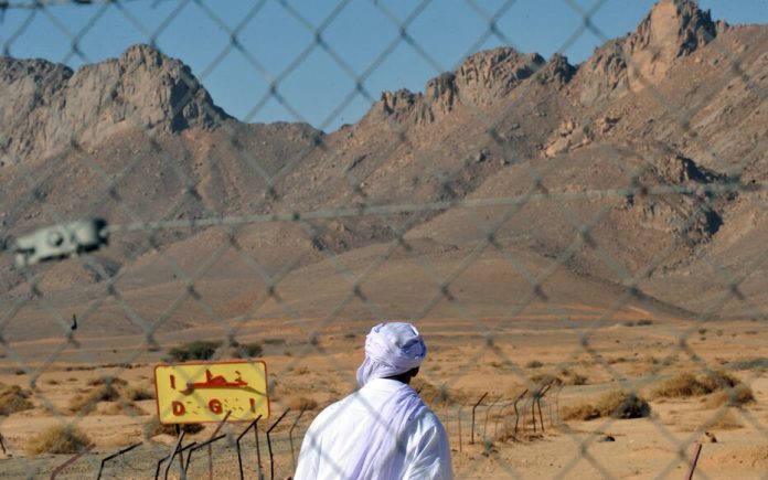An Algerian man is pictured through a fence as he looks at a danger sign at the entrance of the nuclear bomb test site of Tena Fila mountain at Ain Ekra in Tamanrasset 2000 km south of Algiers, on February 25, 2010. During an international conference on nuclear testing in Algiers on February 25 a series of propositions have been presented to efficiently combat the effects of the tests. In the irradiated Algerian desert children are still born with deformities that campaigners blame on the experimental blasts by the French during their occupation of Algeria in the 1960s. AFP PHOTO / FAYEZ NURELDINE (Photo by FAYEZ NURELDINE / AFP)